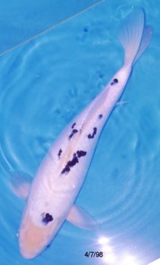 It will be interesting to watch this little Showa continue to develop. It is still a very young fish & has a long way to go, however, it has a famous lineage. This Showa is the direct child of the famous “Inazuma (Lightening bolt) Showa” from Dainichi Yorijyo. The Inazuma showa was the All Japan Show winner in 1991, and was owned by Masao Kato until its demise last year (1998).
