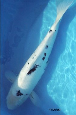 Both of these fish had the benefit of spending time in Brett Rowley’s Mud Pond. The first thing you notice when a fish has spent time in a well managed mud pond is the extreme growth rate. The Bekko (bred by Brett) went from 16″ to 22″ in just 6 months during 1998. {ed: Aware that the date stamps on the two photos indicate this is a 19 month span, not 6 months as the author states.} The Showa went from 4″ to 11″ in just 5 1/2 months during 1999. Details of their development are described below.