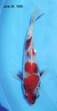 This particular showa is from the second spawning of the Inazuma showa. It was brought to Houston by Shigeru Mano of Dainichi Yorijyo in the spring of 1999. From there it came to Brett’s Fish Farm where it spent the summer and fall in an earthen pond.